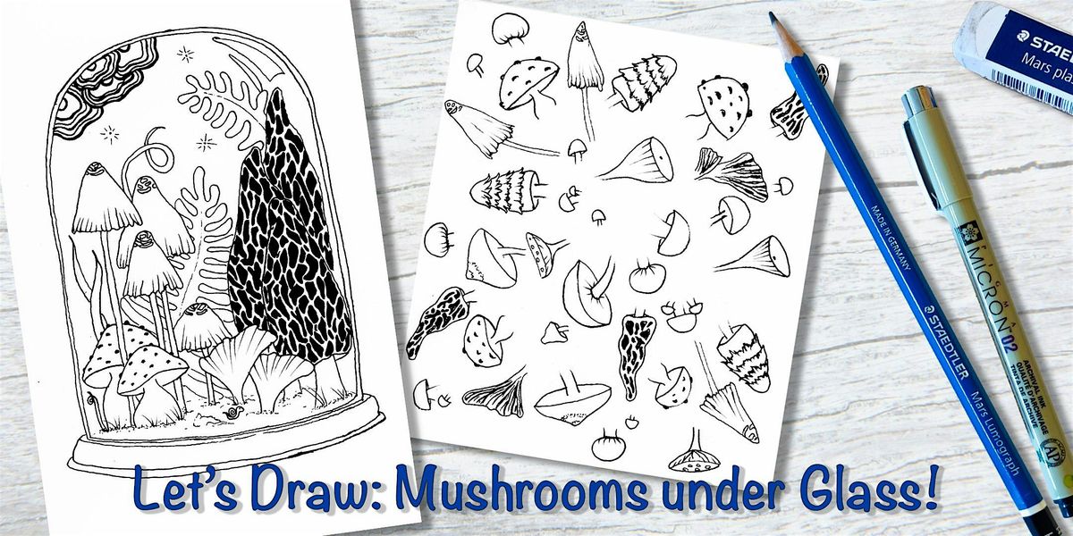 This drawing class is for beginners - don’t be intimidated! We are going to learn to simlify and draw those little woodsy delights, those "fairy stools", those "pixie parasols", those "elf caps" and whatever else you want to call them and make a magical little world in a glass dome that will be ready for you to paint , color or leave as an whimsical ink drawing. (By the way, next month I'll be doing a class on using watercolor pencils and it will be a great opportunity to color/paint your own drawing from this class or use one of my drawings!)
