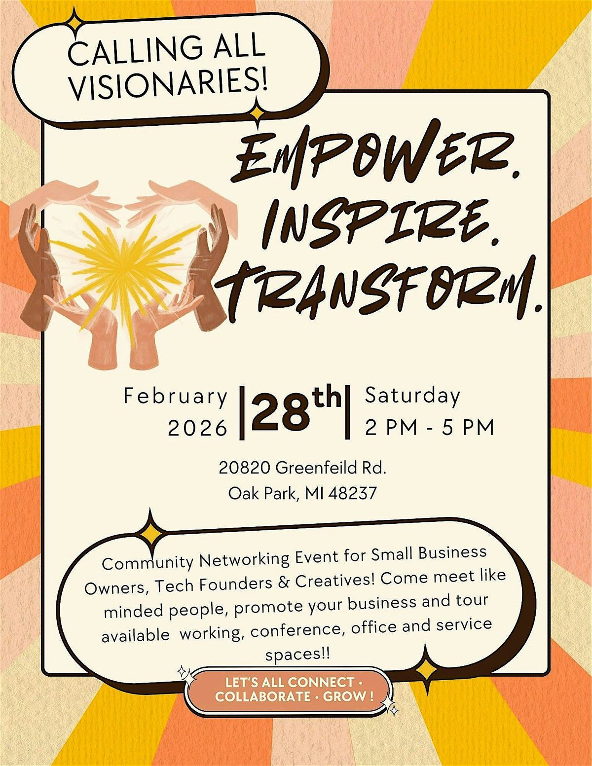 Join us for meaningful dialogue, aligned collaboration, and community rooted in growth. Connect with like-minded entrepreneurs, share what you’re building, and explore available working, conference, office, and service spaces.