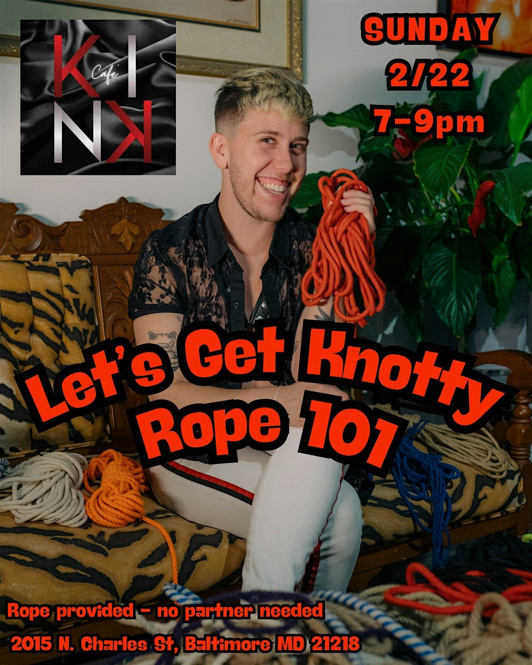 Limited supply of rope will be provided for hands-on practice. No partner required. If you have your own rope, please bring it! Open to all genders, sexualities, and experience levels. Come and play!