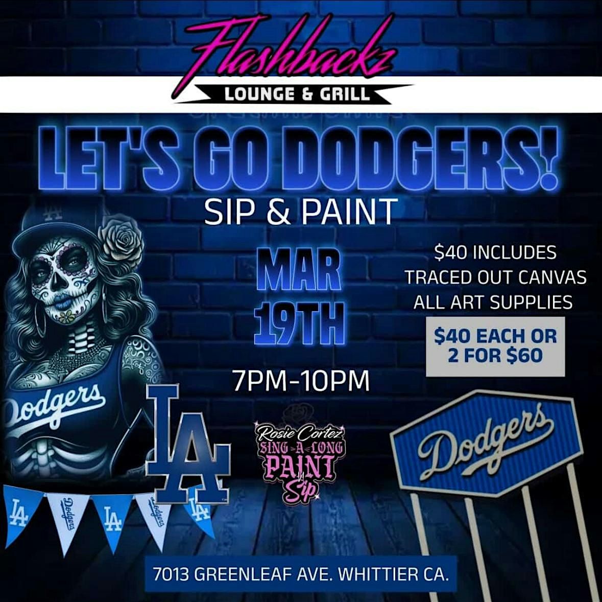 Get ready for a night of blue, paint, and good vibes! Join us for a Let’s Go Dodgers Sip N Paint hosted by the amazing Rosie Cortez on Thursday, March 19th from 7PM–10PM!