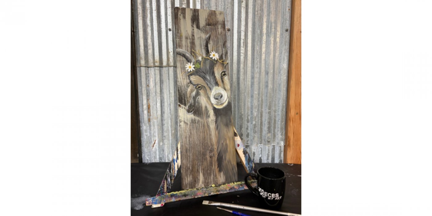 Skip the "blank canvas" anxiety—I’ll have this silly, cock-eyed goat outline already sketched onto your 8x24-inch wood board before you arrive. We’ll use a few brushes and bottles of paint to bring his messy straw and garden daisies to life.