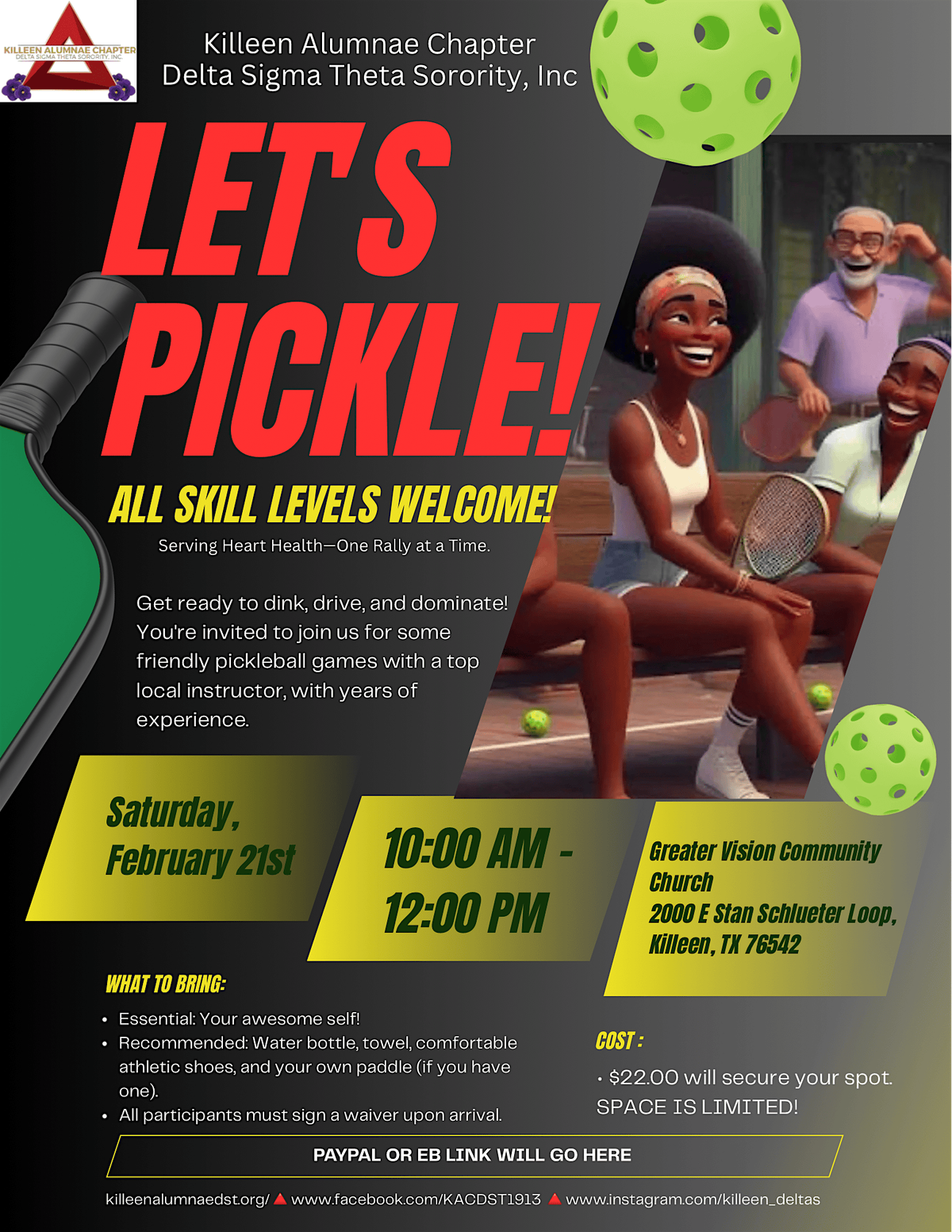 Get ready for a super fun in-person event all about the art of pickling! Whether you're a pickle pro or just curious, join us for some friendly pickleball games with a top instructor with years of experience. It's gonna be a blast!