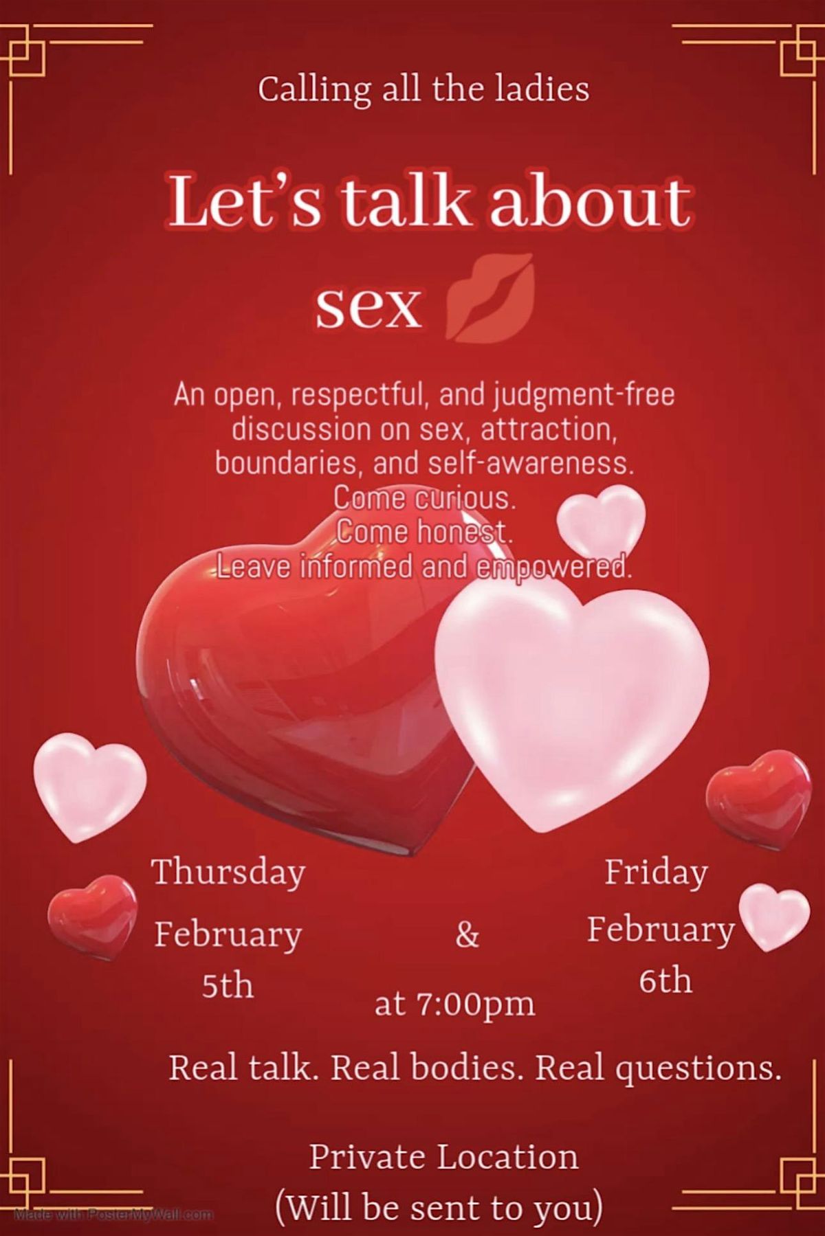 Grab your favorite lipstick, pour a glass of bubbly and come join us for a Valentine's-themed get-together made just for the ladies. Let's Talk About Sex is a two-day warm, judgement-free space to laugh, learn and have real conversations about love, intimacy, relationships, and "everything" in between. Expect honest dialogue, a little spice, plenty of demonstrations and to learn a few new tips and tricks to add to your resume. Come open, eager to ask those uncomfortable questions, and leave empowered.