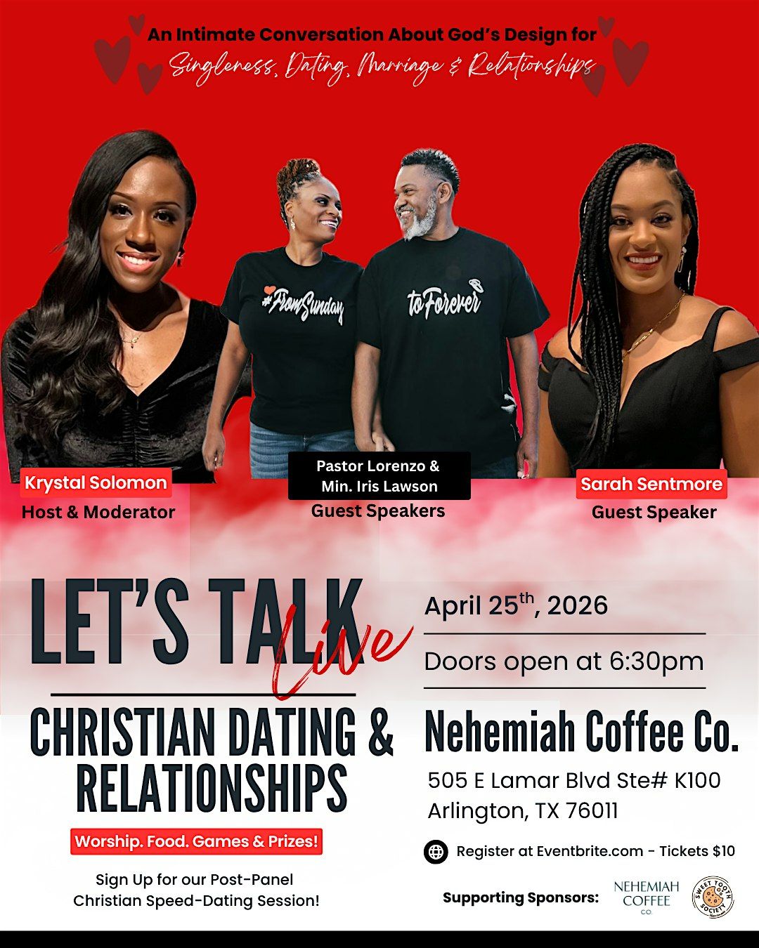 Join us for an honest, fun, and faith-filled conversation about God’s original design for love and relationships. This is a safe space where honesty is welcomed, wisdom is shared, and feedback is encouraged. There will be food, music, games, prizes, worship, prayer and real conversation! So come with your questions AND comments! Whether you’re single, dating, in a relationship, or married, this night is for you!