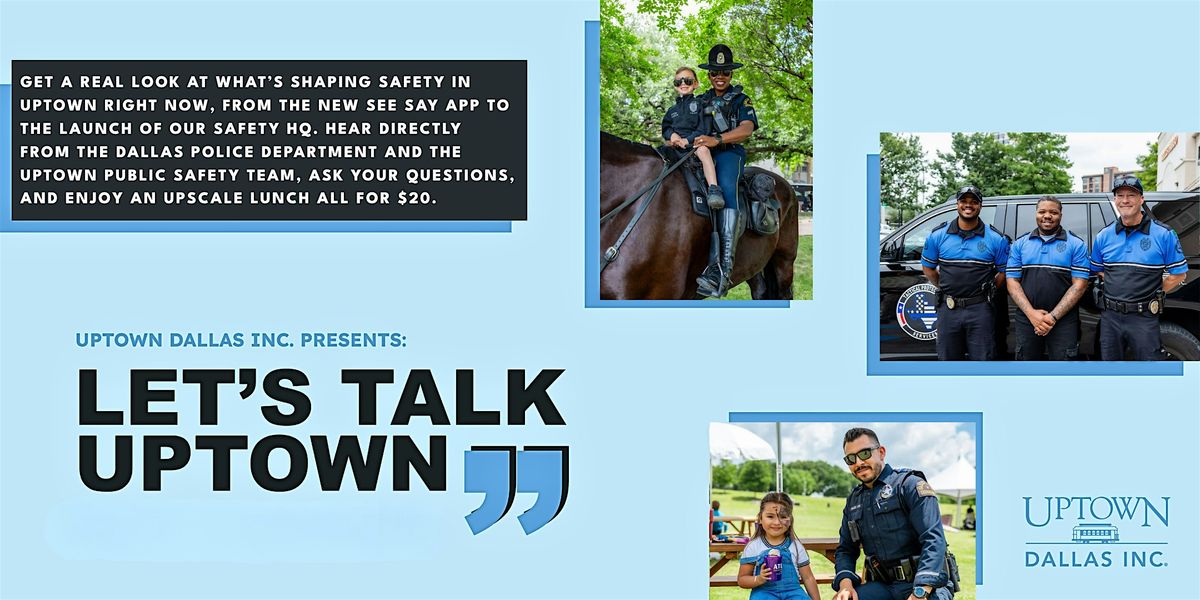 Uptown Dallas Inc. presents Let’s Talk Uptown: Public Safety in Uptown Dallas, a panel-style luncheon offering a real look at the state of safety across the district. From the launch of the See Say app to the opening of our new Public Safety HQ, this conversation will give attendees direct access to DPD and the Uptown Public Safety Team for insight, transparency, and dialogue.
