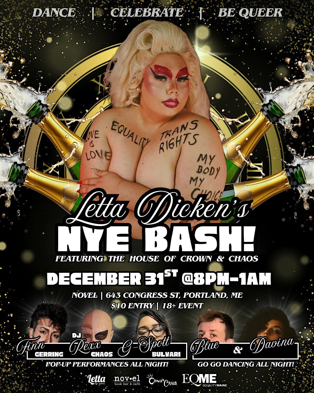 Dance, Celebrate, and Be Queer at Novel for Letta Dicken's New Years Eve Bash! A night to ring in the new year in community with Pop up Perofmances athrough out the night featurng The House of Crown and Chaos; and enjoy our fabulouse Go Go Dancers Blue and Davina dancing all night, with sick beats and music to dance the night away by DJ Rexx Chaos, presnted by your hostess, Letta Dicken!