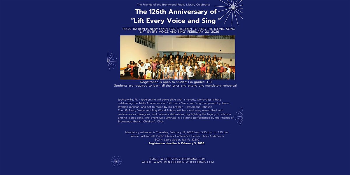 Students grades 3-12 are invited to sing "Lift Every Voice and Sing" in a historic world-class tribute performance. Registration required!About this Event