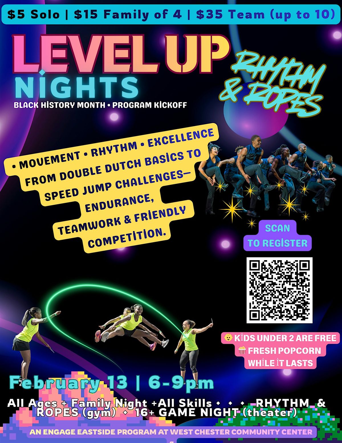 Level Up Nights: Rhythm & Ropes is a high-energy, inclusive movement night rooted in rhythm, teamwork, and excellence.