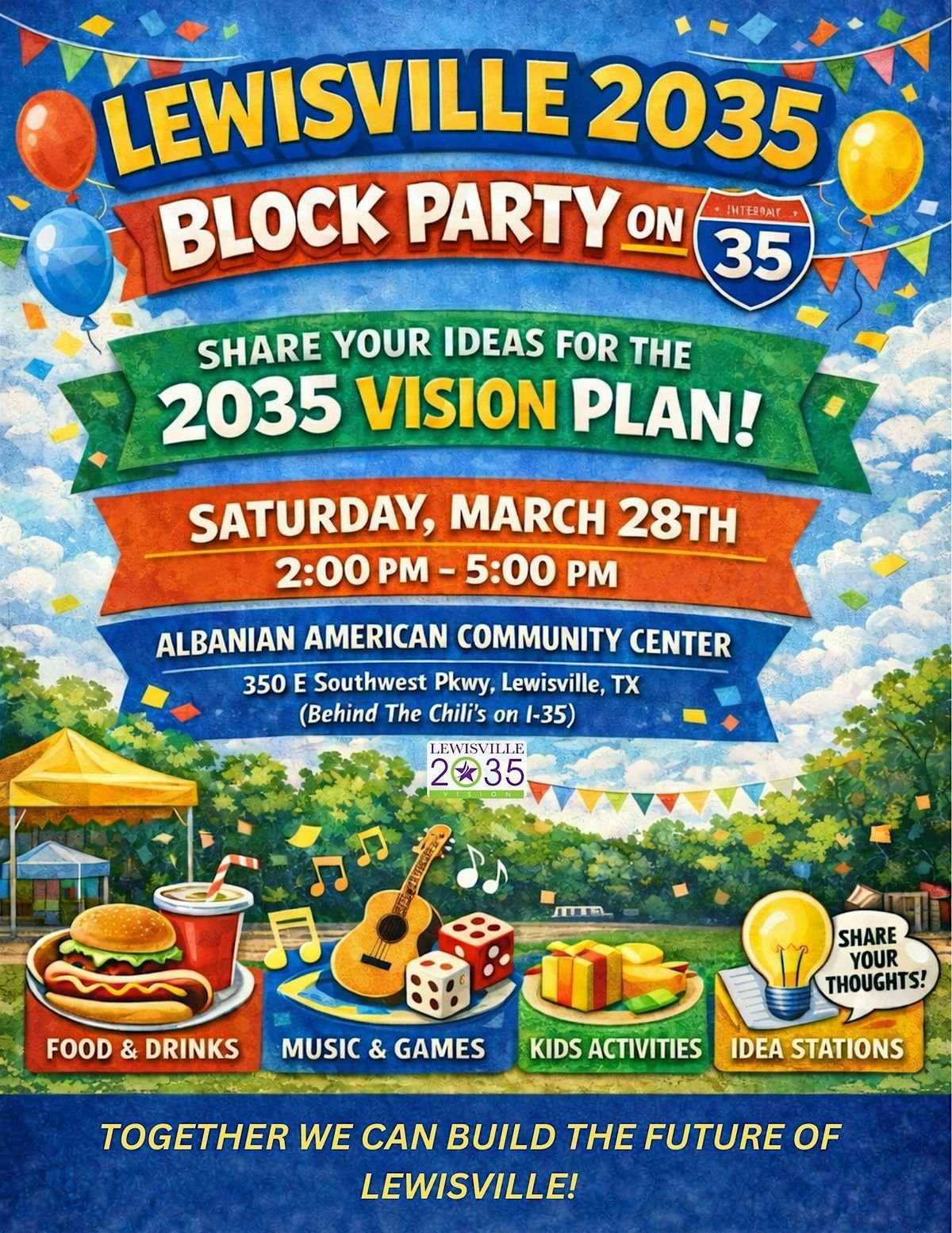 Join us in person for a FREE, fun-filled day where neighbors and kids come together to share ideas, enjoy great food, music and activities, while we envision what Lewisville will look like in 2035.