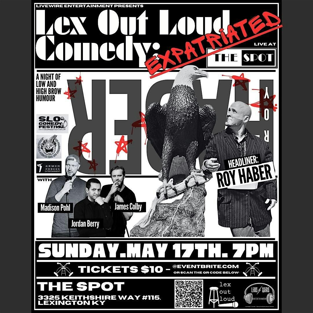Lex Out Loud is back! Join us on Sunday, May 17th at the Spot for the homecoming of, and subsequent send off of hometown comic hero, Roy Haber! Torn between highbrow substance and lowbrow laughs, we've decided to combine the best of both worlds to an otherwise pretty humourless world. You'll get to hear words like, "antidisestablishmentarianism," balanced by life's cruder foibles, as you wash down delicious beverages and chuckle at the fantastic lineup. Roy is joined by Madison Pohl, James Colby, and Jordan Berry.
