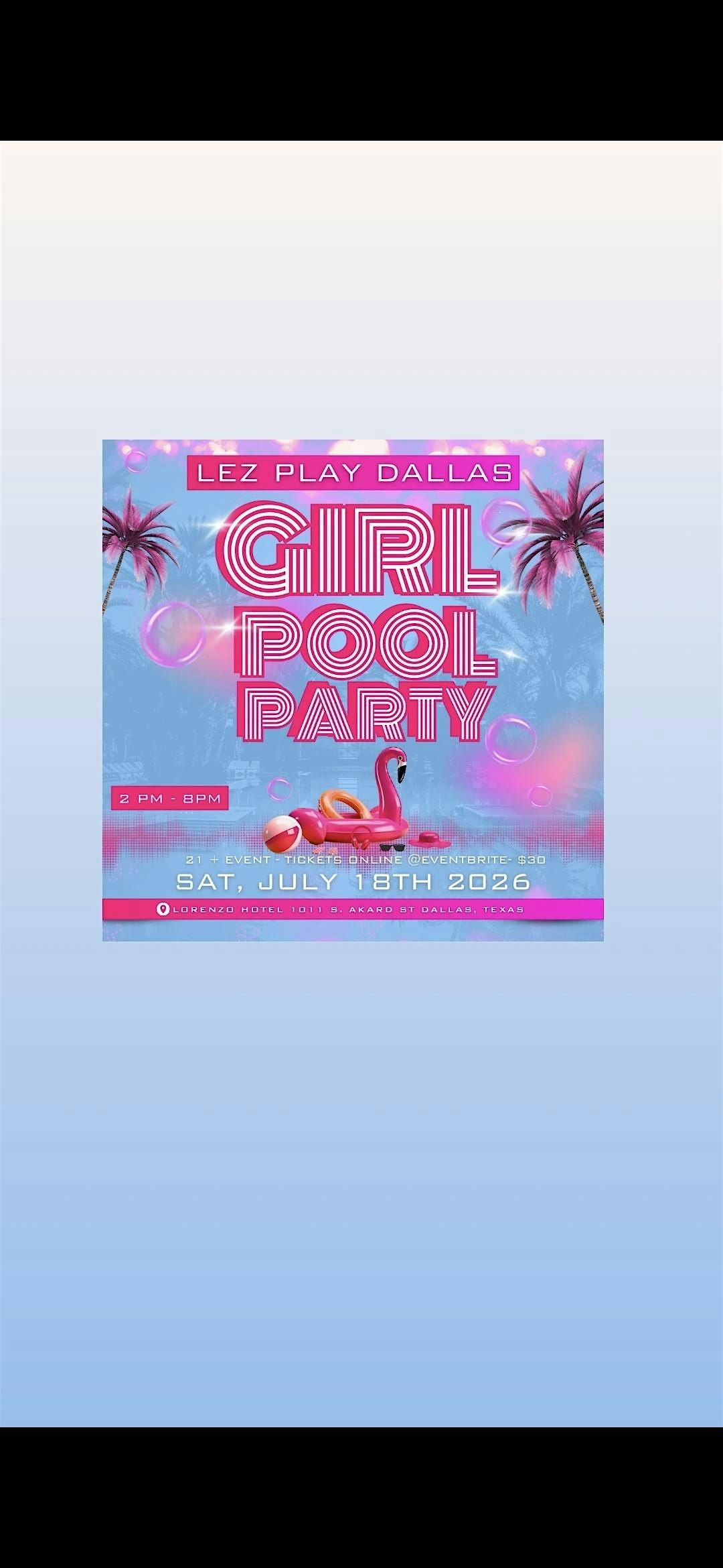 Get ready to make a splash at the Lez Play Dallas Girl Pool Party! Join us on Sat Jul 18th 2026 at Lorenzo Hotel 1011 S. Akard St. , Dallas, TX 75215 for a day of sun, fun, and good vibes. This in-person event is the perfect opportunity to meet new people, catch up with old friends, and enjoy the company of like-minded women.
