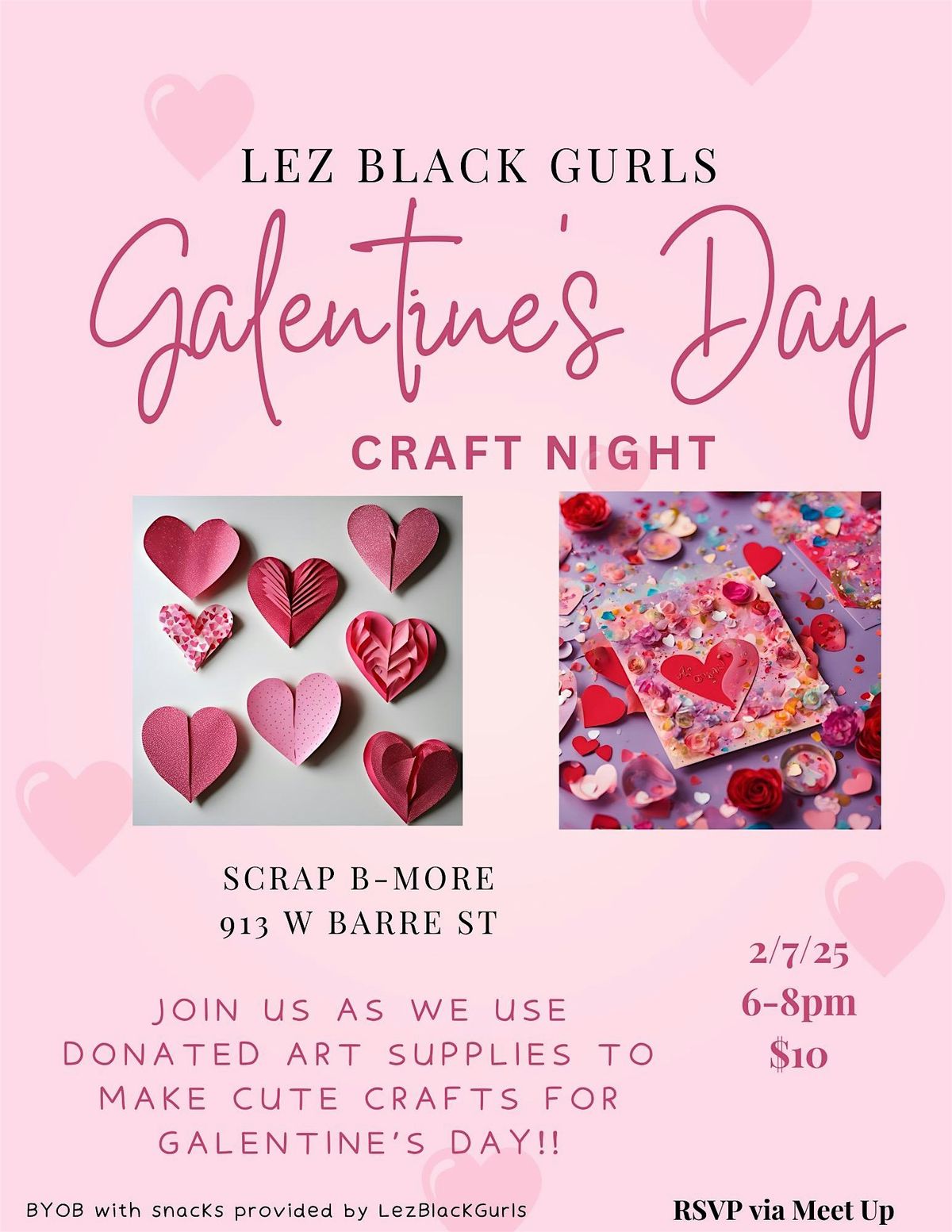 We're having a fun night using donated art supplies courtesy of Scrap Bmore to make cute crafts for Galentine's Day. You might even meet some new friends while you're at it. We'll be there on Friday, Feb 6th 6-8pm. Tickets are only $10!