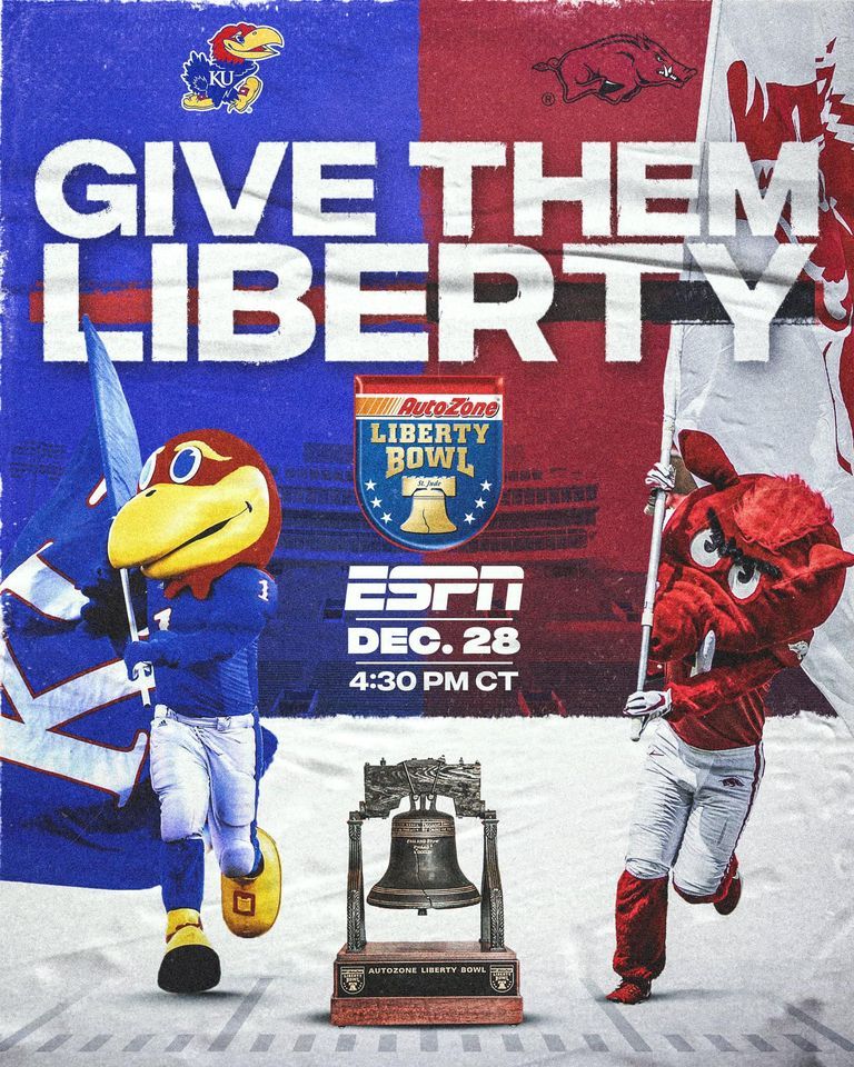 LIBERTY BOWL 2022 - (6-6) KANSAS JAYHAWKS v (6-6) ArKANSAS Razorbacks on Wednesday 12-28-2022 at 12:30pm hst on ESPN. The early line on this game is KANSAS +3 and espn gave KU 42.2% chance for the win. Long story short: Watch party in San Diego and Hawaii on Oahu!A bowl drought since 2008 is finally over. All of the current student body was in Grade School when KU won the Orange bowl that year. Unless they were from the Lawrence, the general area or parents were Alumni they have no memory of that game. This is actually quite sad really, but I digress… This years bowl is KU’s 13th appearance which isn’t terrible, but in a P5 conference it kinda is. A strange metric is that Kansas is 6-6 this season and 6-6 in Bowl games over their history in bowl games. AND KU has won five of its last six bowl games, and has not lost a bowl since getting wooped by NC State in the 2003 Tangerine Bowl, the first bowl of the Mangino years. Let us hope that LL first bowl game goes better than Mangino's first bowl game did. You know Mizzou refused to play KU in the Liberty Bowl… Side rant why is the Liberty Bowl in Memphis and not in Philly? Anyone else find that strange? Did they move the Liberty Bell to Tennessee? It’s like the Hawaii Rainbow Bowl being played in IDK like Idaho or something… anyway back on track now… and Fizzou had a 6 million payout for the Liberty Bowl. Instead they opted for the "Gasparilla Bowl". Payout....$1.25 million… hahahaha Mizzou being Mizzou… AssHats.
