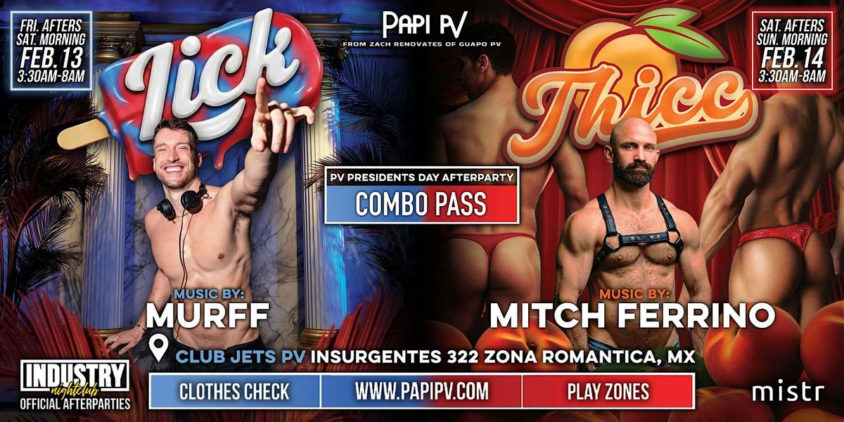 We are back with a President's Day LICK & THICC with DJs MURFF and Mitch Ferrino! For these official Industry afterparties, we are located at CLUB JETS PV just steps from Industry conveniently located in the heart of Zona Romantica in Puerto Vallarta, MX.
