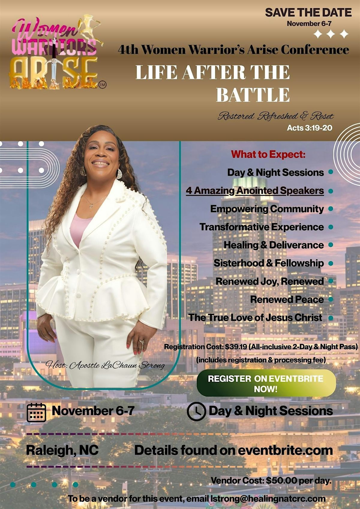 Hosted by Apostle LaChaun Strong, this conference will feature anointed speakers, dynamic day and night sessions, and a transformative atmosphere where women can encounter the presence of God in a real and life-changing way.