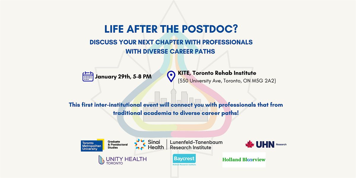 Are you wondering what life looks like after the postdoc? Join our round-table discussions with professionals with diverse and rewarding careers outside of academia. The event will be held on Thursday, January 29th, 2026, from 5PM to 7PM (+ optional networking hour) in the KITE Auditorium of the Toronto Rehabilitation Institute (550 University Ave, Toronto, ON M5G 2A2).