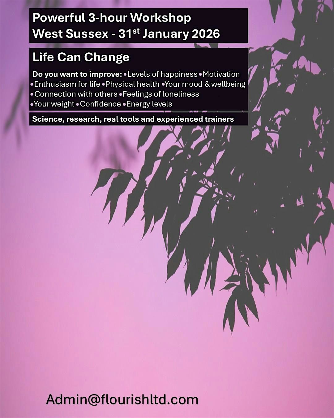You will leave with new strategies and tools you can try in everyday life and working at a level that suits your individual circumstances. This workshop is for anyone who wants to improve and grow.