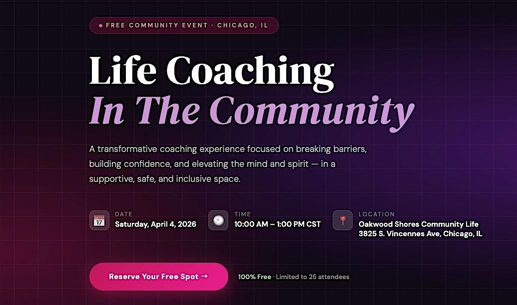 This isn't just a workshop, it's a movement. Life Coaching In The Community brings certified coaching, meditation, and personal development directly into the heart of Chicago's South Side. Through guided conversation, mindfulness, and action planning, you'll walk away with practical tools and a renewed sense of your intentions.