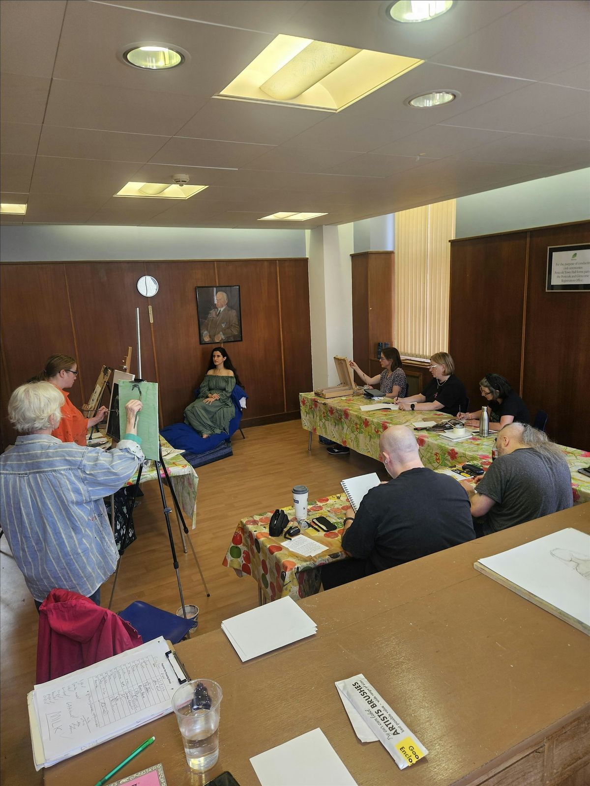 If you are using fixative, please take your piece outdoors to spray it outside. There is a lift in the town hall. Please email me in advance if you need to make use of the ramp to get in the building. I would look to give the caretaker a heads up, as the community cafe is closed this week, and that has the ramp access. Parking can be paid for at the b and m car park, or you can park for free opposite the Navaar hotel or on local side streets.