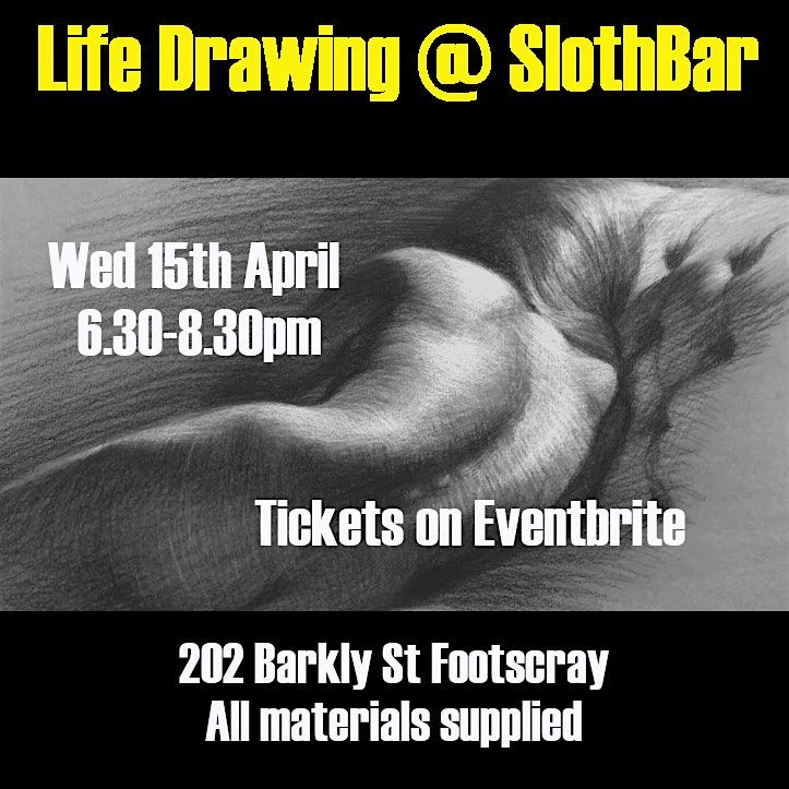 Sloth bar will be running a 2 hour life drawing sessions. Our model will be Misha. Wednesday 15th April 6.30-8.30. All materials supplied. This is a ticketed event as there are limited places. There is a bar downstairs where people can purchase drinks if they like. There will be regular breaks. Please arrive early to set up.