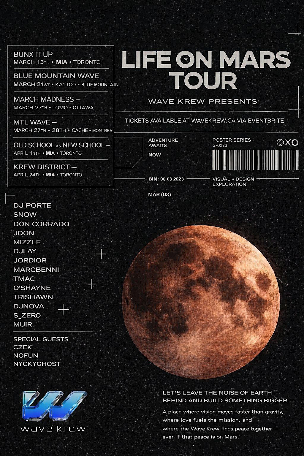 Life On Mars Tour One pass. All access. Bunx It Up, Blue Mountain Wave, March Madness, MTL Wave, Old School vs New School & Krew District