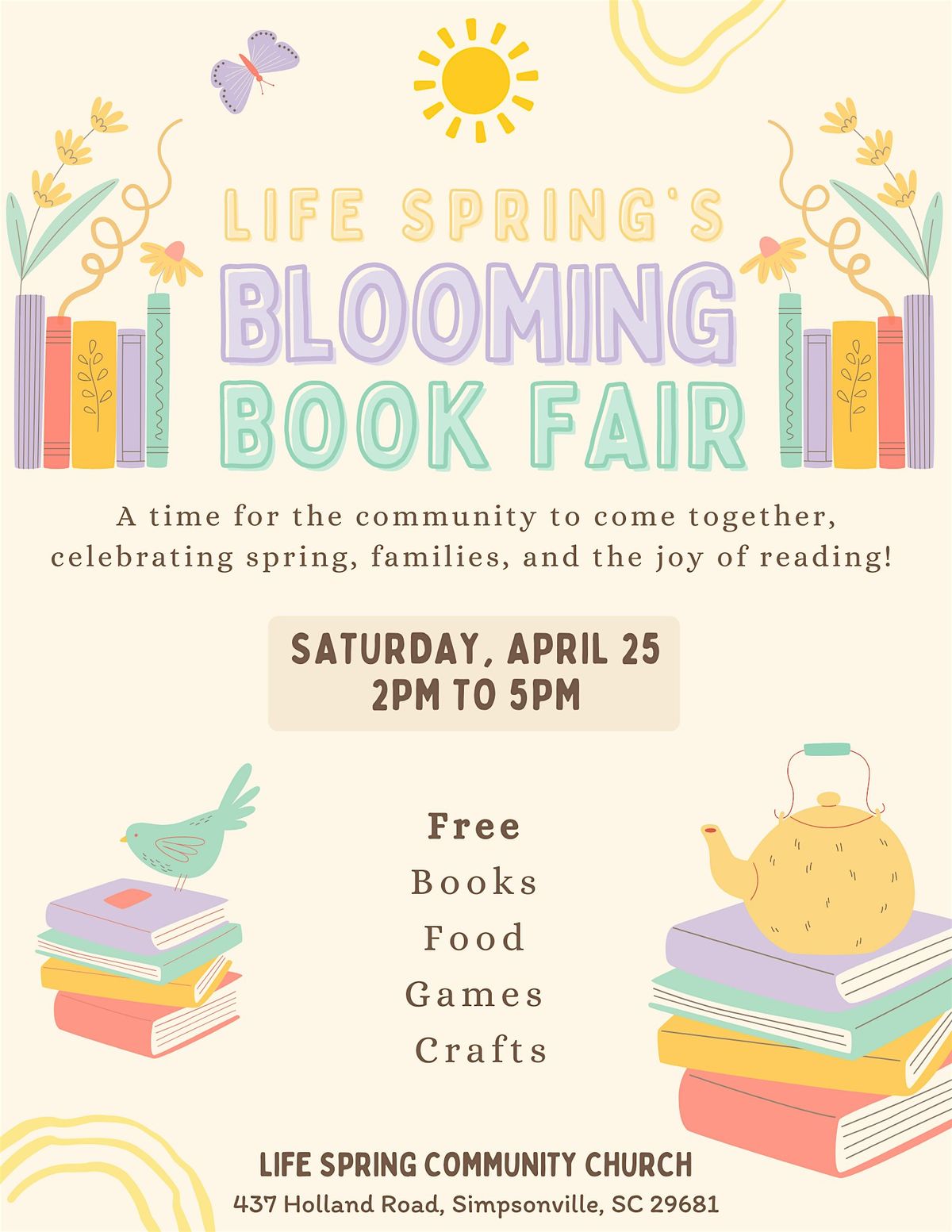 Blooming Book Fair is a free, community event hosted by Life Spring Community Church in Simpsonville!