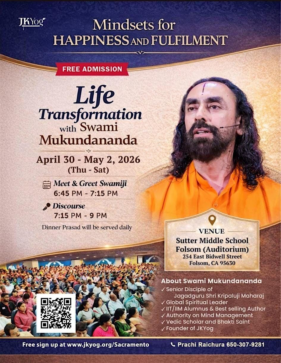 Let us all enthuse ourselves as Swami Mukundananda Ji is arriving in our town on Apr 30, 2026, to conduct 3 days of the "Life Transformation Program."
