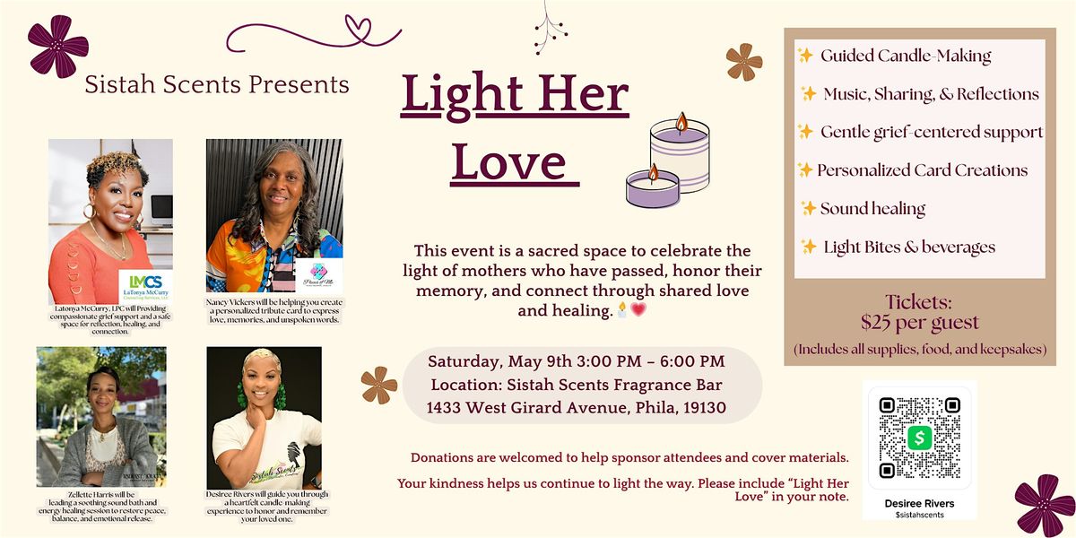 Join us for Light Her Love: A Mother’s Day Healing Experience, a beautifully curated gathering designed to honor and remember the mothers and mother figures who live on in our hearts.