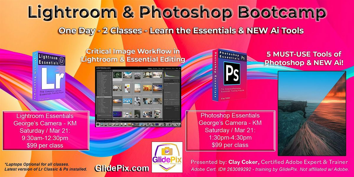 Join us for a fun filled two part series workshop at George's Camera. Learn critical image workflow in Lightroom Classic and essential editing with Adobe Certified instructer, Clay Coker.