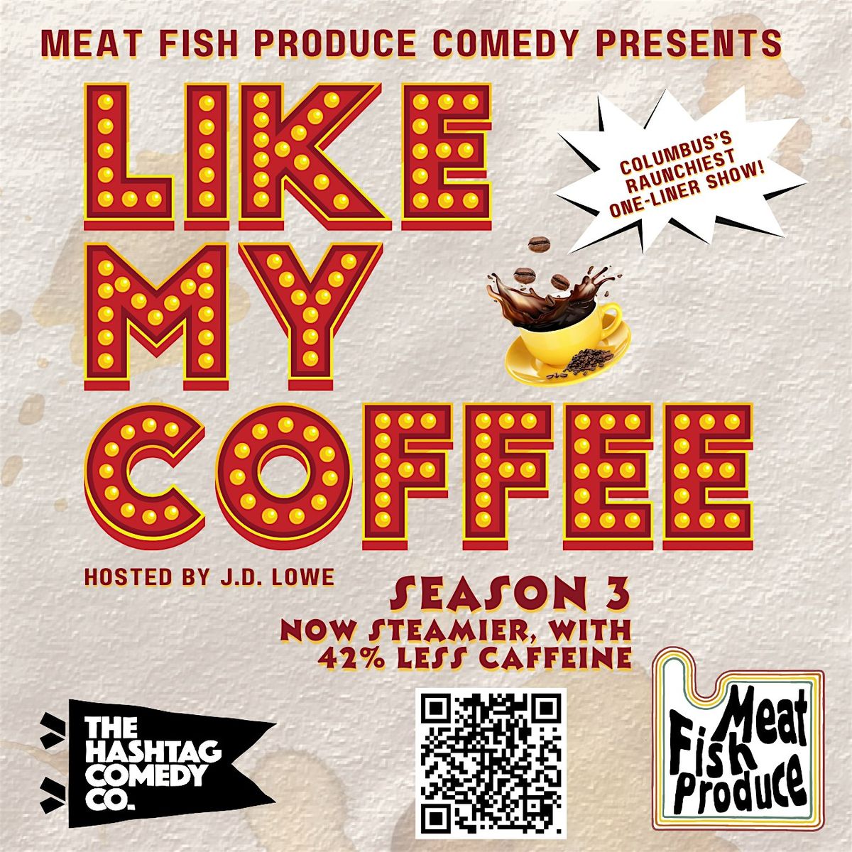 Meat Fish Produce Comedy is proud to present its third season of Columbus's best raunchy comedy game show, "Like My Coffee" at Hashtag Comedy Club!