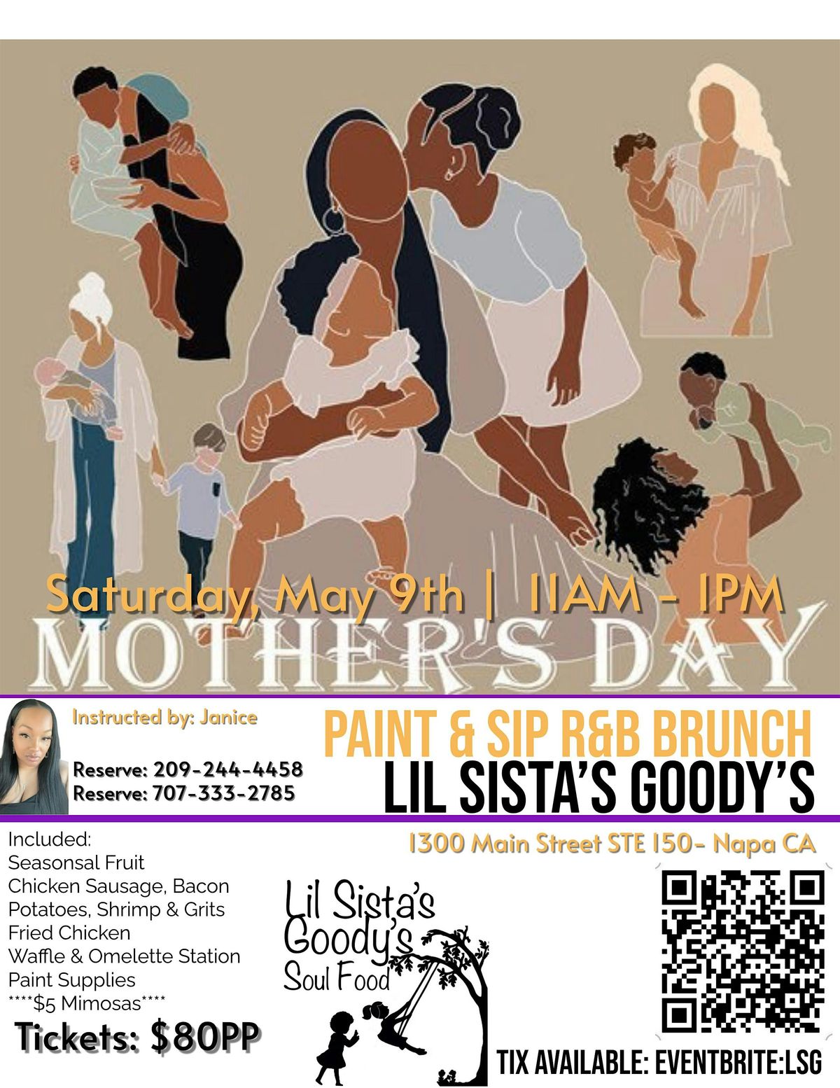 Happy Mothers Day Ladies!!! Come celebrate with your Mothers and Family on our Saturday R&B Paint & Sip Brunch. We have a Great Menu : seasonal fruit, chicken sausage, bacon, potatoes, shrimp & grits, fried chicken, waffles & omelette station. Mimosas available for $5, full paint supplies all instructed by Janice and Sounds by Dj QUELLY QUELL