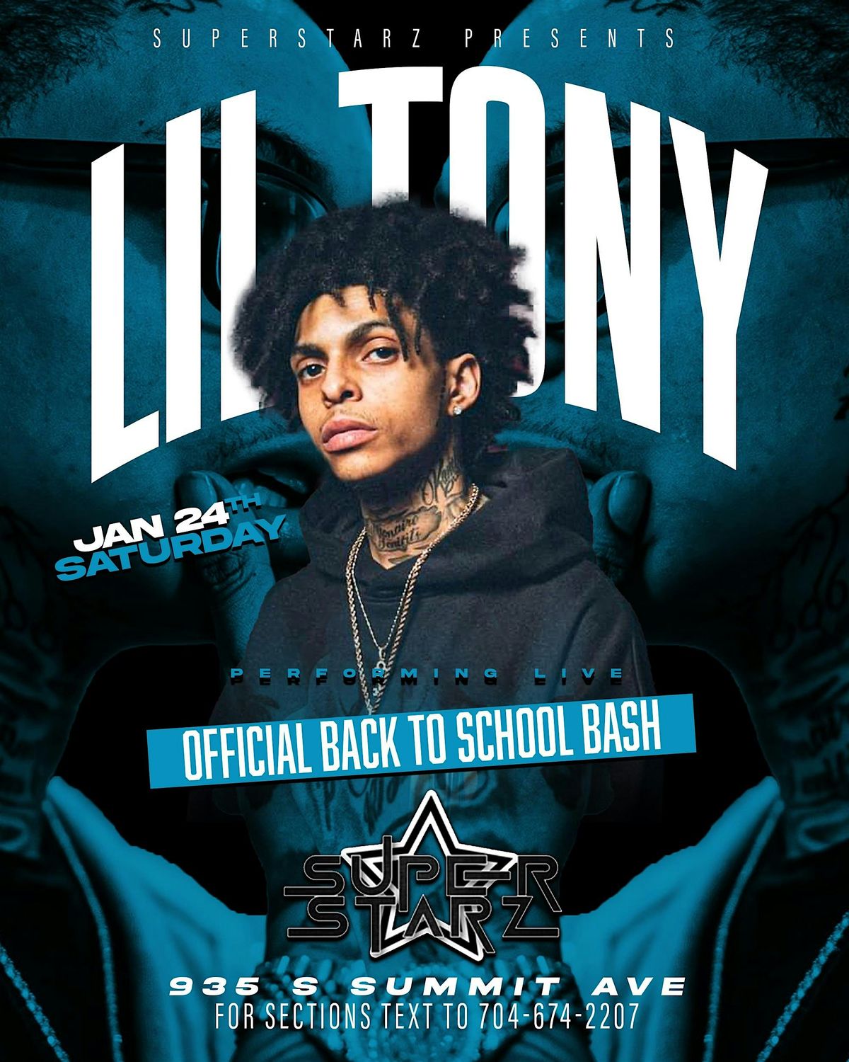 Welcome to LIL TONY PERFORMING LIVE @ SUPERSTARZ at Superstarz CLT! Get ready for a night of incredible music and vibes. Join us on January 24, 2026 at 10:00 PM (Eastern Time) for an unforgettable experience. Don't miss out on this epic event! See you there!