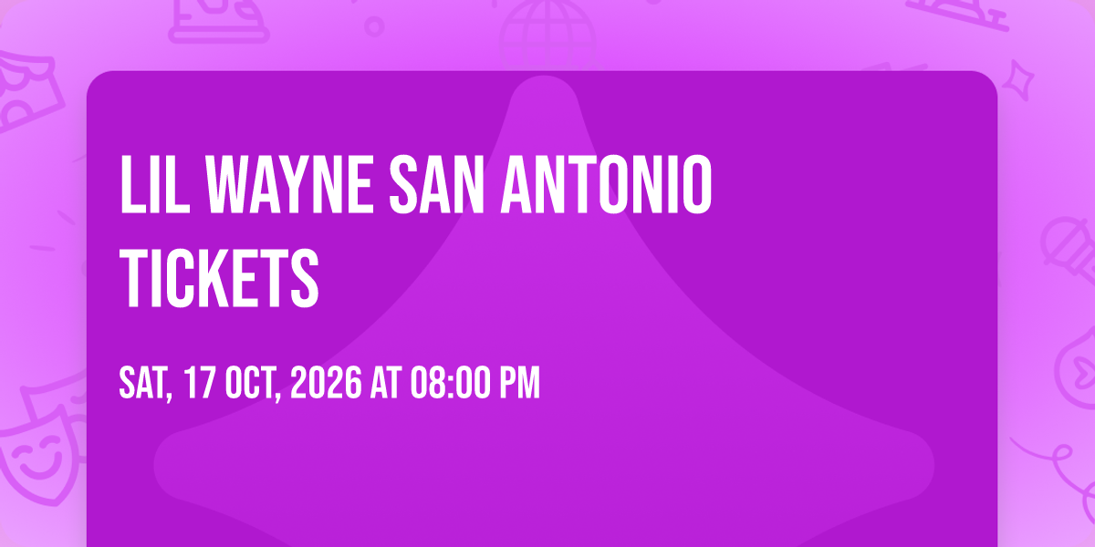 Lil Wayne at Frost Bank Centerโจ Enter a world of endless possibilities at Lil Wayne San Antonio Tickets, where every moment tells a story! ๐๏ธ The stunning Frost Bank Center in vibrant San Antonio, TX transforms into a realm of wonder on October 17th, 2026 at 08:00 PM. ๐ They have crafted an experience that goes beyond the ordinary, combining elements of surprise, delight, and pure entertainment. Every detail has been thoughtfully considered to ensure your journey with us is nothing short of extraordinary. ๐ฏ Join fellow adventure seekers and memory makers in this celebration of imagination and innovation. โจ With tickets available at 51.29 EUR, your journey awaits. ๐ Reserve your spot today and be part of something truly special!