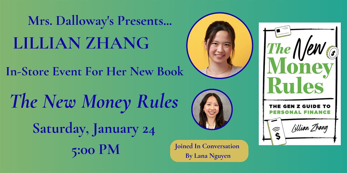 Join us at Mrs. Dalloway's Bookstore on Saturday, January 24 at 5:00 PM when financial expert Lillian Zhang comes to the store to present her new book The New Money Rules: The Gen Z Guide to Personal Finance. Lillian will be joined in conversation by Lana Nguyen and will sign copies of her book after the presentation.