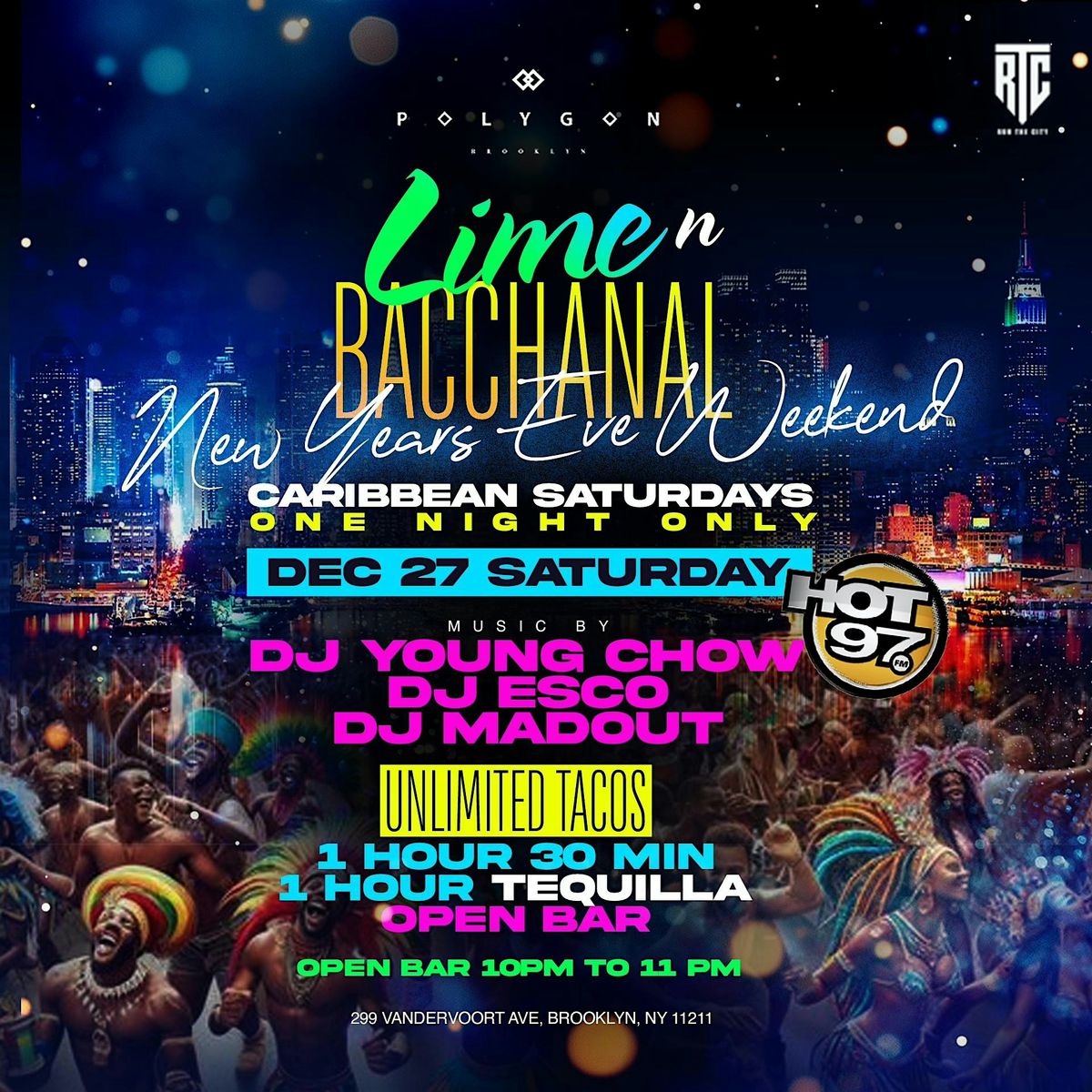 Celebrate New Year’s Eve Weekend at Polygon with Lime & Bacchanal—Caribbean vibes all night with soca, dancehall, afrobeats, and hip-hop from top DJs. Enjoy a 1-hour tequila open bar and 1.5 hours of tacos to kick off the party, plus high-energy countdown moments, photo-ready scenes, and VIP/bottle-service options. Capacity is limited—secure your spot now and arrive early to maximize open-bar and taco times. Perfect for crews looking for a fun party at Brooklyn’s premier venue.