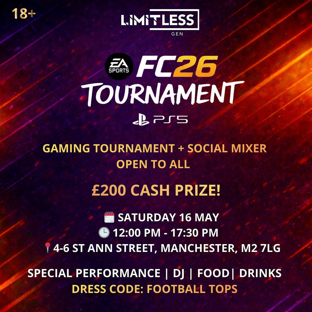 Limitless Gen presents the FC26 Tournament and Social, a summer launch event bringing together football, gaming, music, and community at Cupra Garage in Manchester. Compete in the FC26 tournament or join as a spectator and enjoy live DJ sets, welcome drinks, great food, and a live performance ahead of the final.