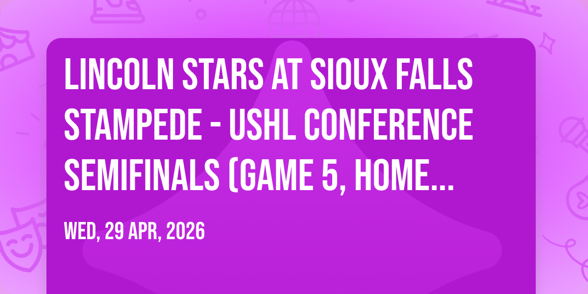 📍 Location: 43.5635, -96.747🎉 Welcome to Lincoln Stars at Sioux Falls Stampede - USHL Conference Semifinals (Game 5, Home Game 3), where dreams come alive and possibilities are endless! 🏛️ Join us at Denny Sanford Premier Center in the heart of Sioux Falls, SD for an event that defies expectations. 📅 On April 29th, 2026 at 12:05 AM, be part of something truly extraordinary as we bring together innovation, entertainment, and pure magic. ✨ Every aspect has been carefully designed to ensure an unforgettable experience for all our guests. Whether you're seeking adventure, inspiration, or simply a break from the ordinary, this event promises to deliver beyond your wildest dreams. 🎊 Prepare for a journey into the extraordinary!