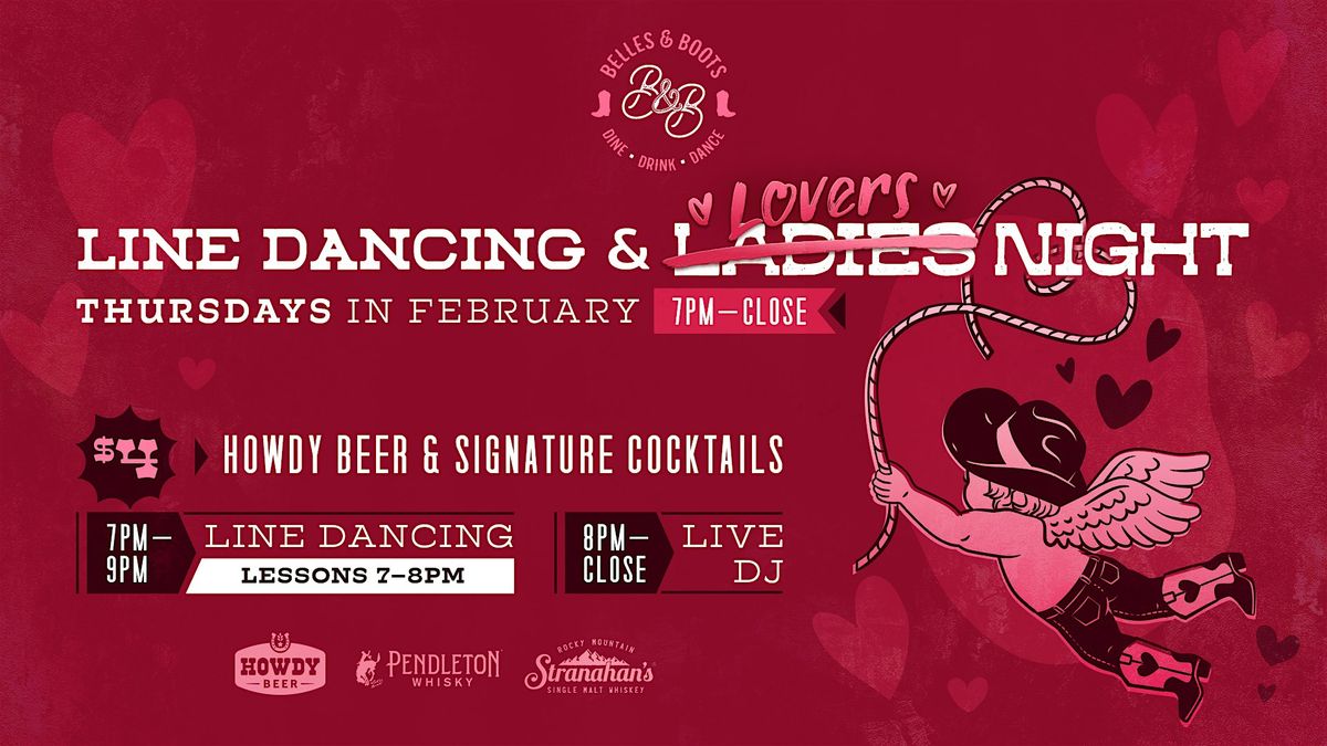 Thursday nights at Belles & Boots get a Valentine's twist with Line Dancing & Lovers Night — blending country hits, boot-scootin' fun, and whiskey-forward specials all month long. Start the night with line dancing lessons, stay for Ladies Night drink deals, and keep the party going with a live country DJ and rotating Lovers Night whiskey takeovers.