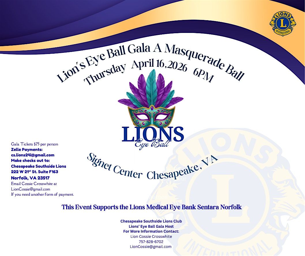 Chesapeake Southside Lions Annual Charity Gala Masquerade Ball April 16 2026 6pm