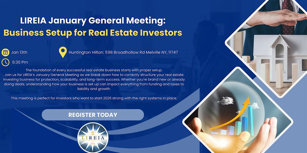 Join us for the LIREIA January General Meeting at the Huntington Hilton, where we’ll focus on the essential business setup strategies every real estate investor needs to understand. From protecting yourself and your assets to positioning your business for funding, taxes, and long-term growth, this meeting covers the fundamentals that can make or break your success.