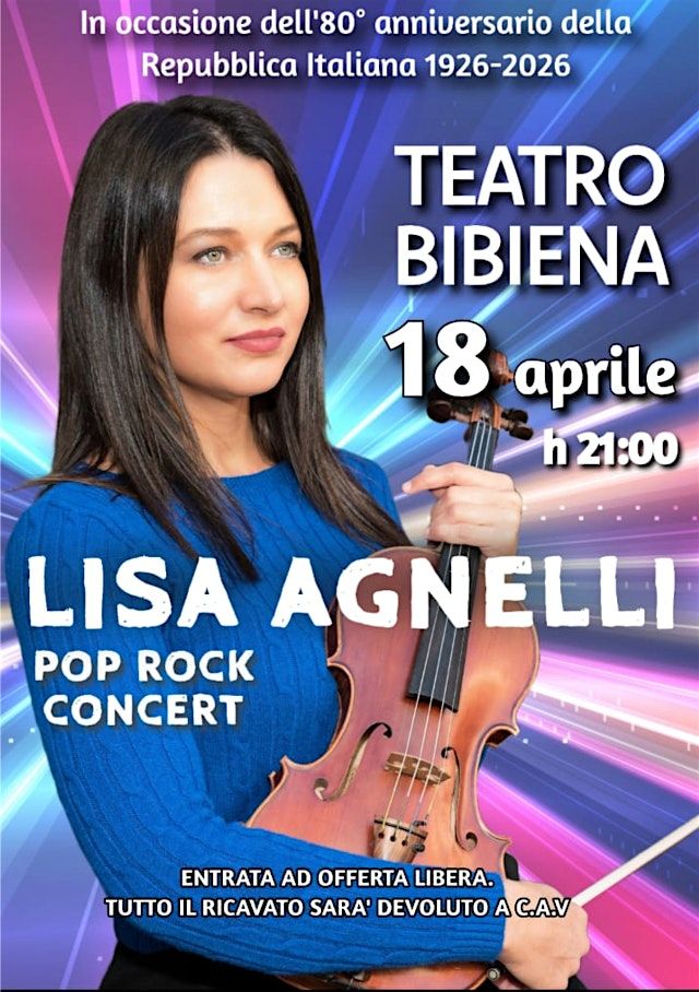 Lisa Agnelli è la prima violinista pop rock strumentale italiana. Sul palco con lei: chitarra, pianoforte e batteria dal vivo, archi LED e scenografia. Uno spettacolo coinvolgente e di forte impatto emotivo, pensato per emozionare il pubblico di ogni età.
