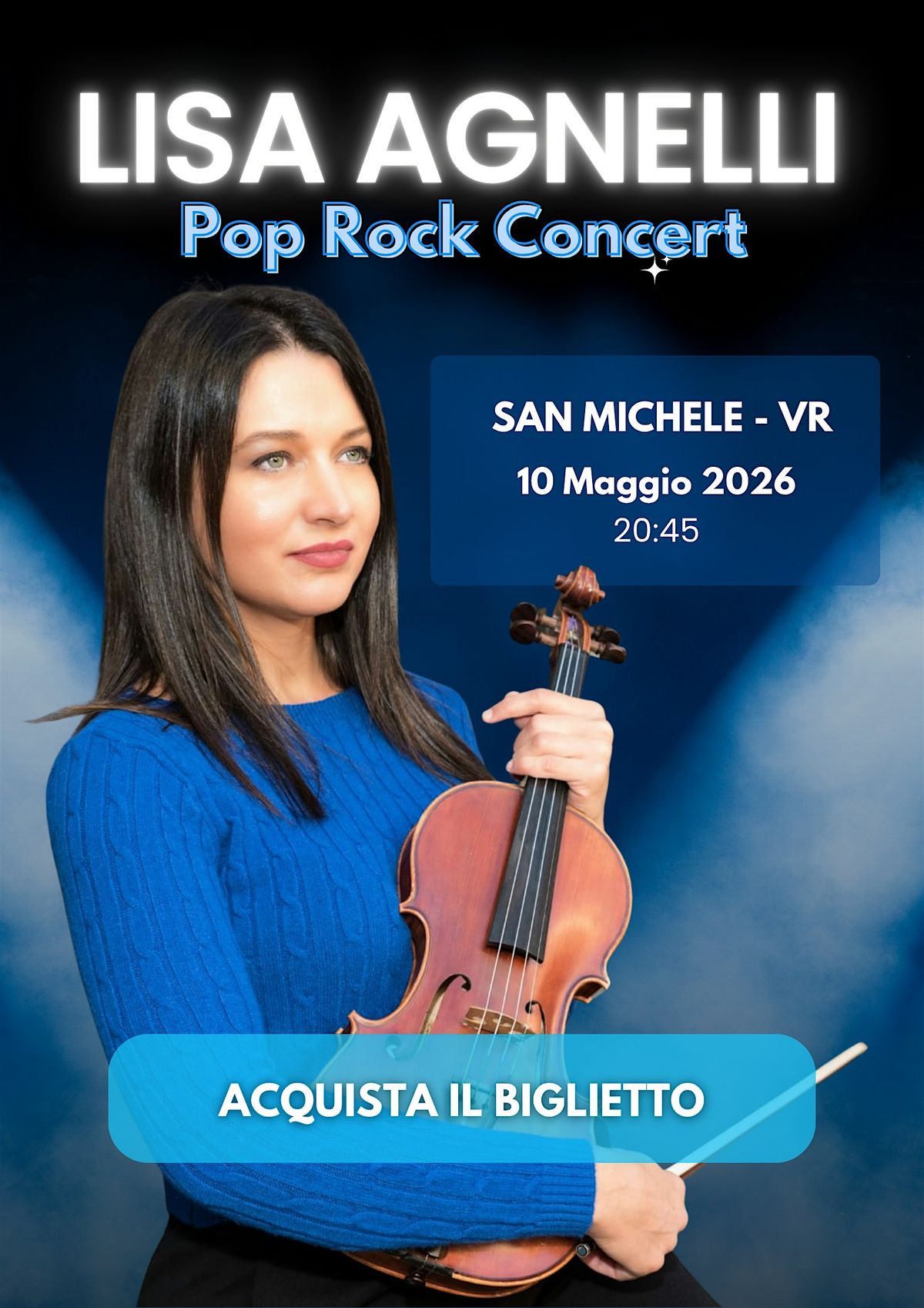 Lisa Agnelli è la prima violinista pop rock strumentale italiana. Sul palco con lei: chitarra, pianoforte e batteria dal vivo, archi LED e scenografia. Uno spettacolo coinvolgente e di forte impatto emotivo, pensato per emozionare il pubblico di ogni età.