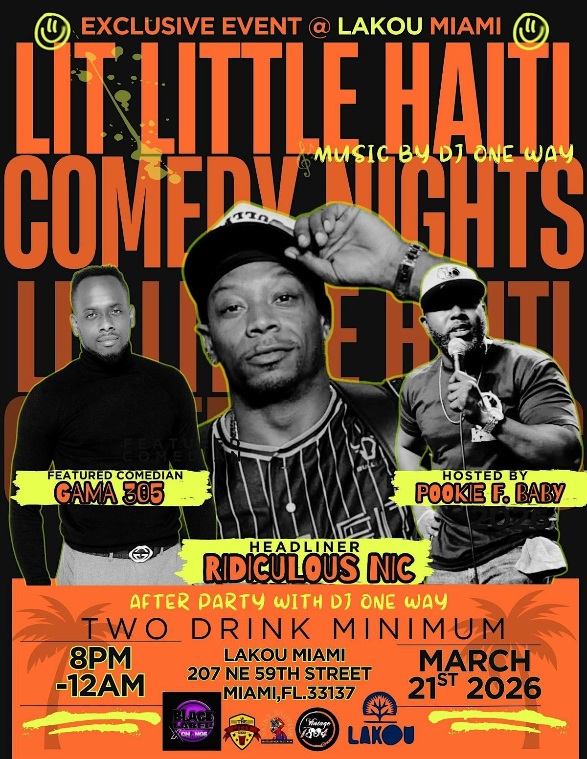 Come join us for a night full of laughs and good vibes at LIT "LITTLE HAITI" COMEDY NIGHTS. This in-person event brings some the funnest comedians together to keep you entertained and rolling. Bring your friends, grab some snacks, and enjoy a chill outdoor evening packed with jokes, stories, and unforgettable moments. Don't miss out on the fun!