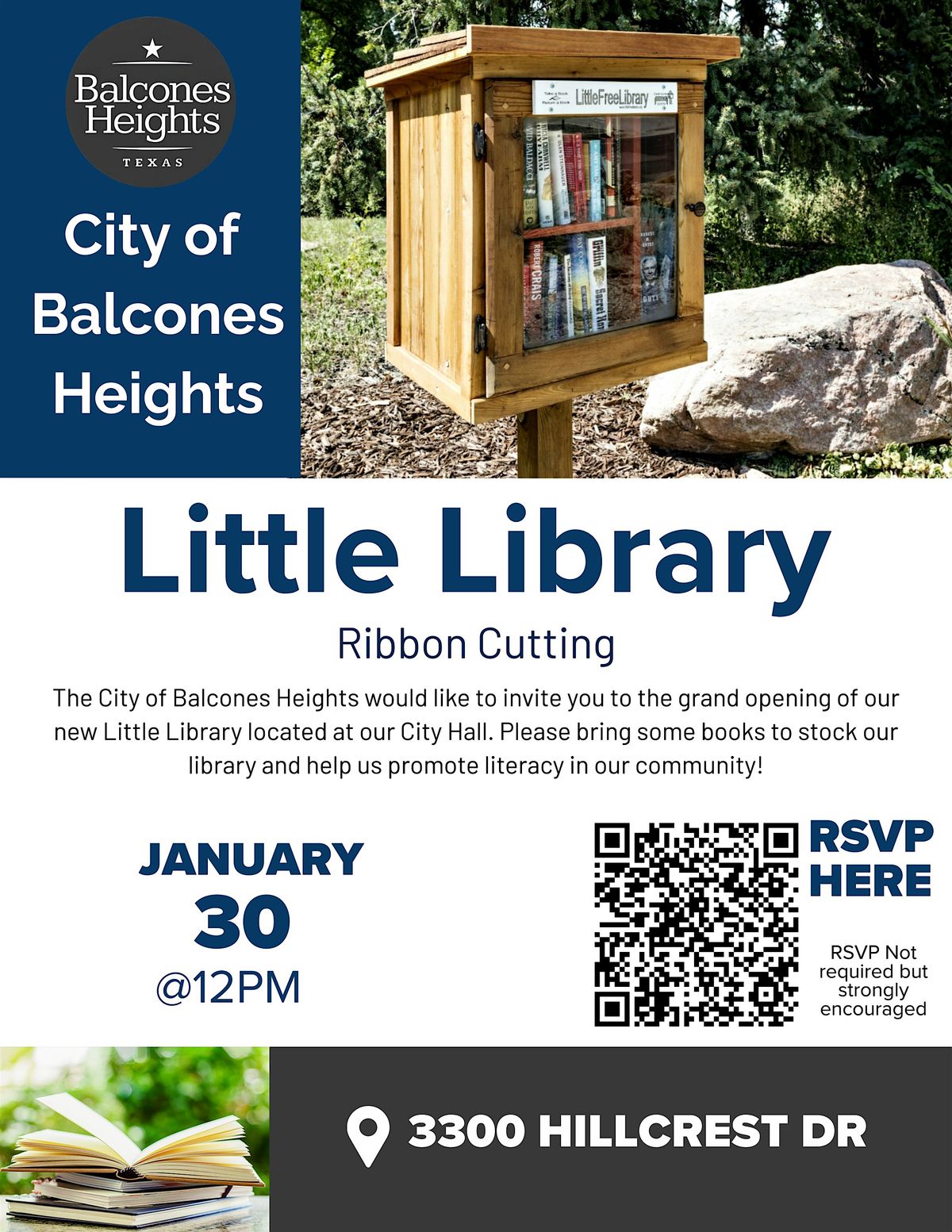 The City of Balcones Heights would like to invite you to the grand opening of our new Little Library located at our City Hall. Please bring