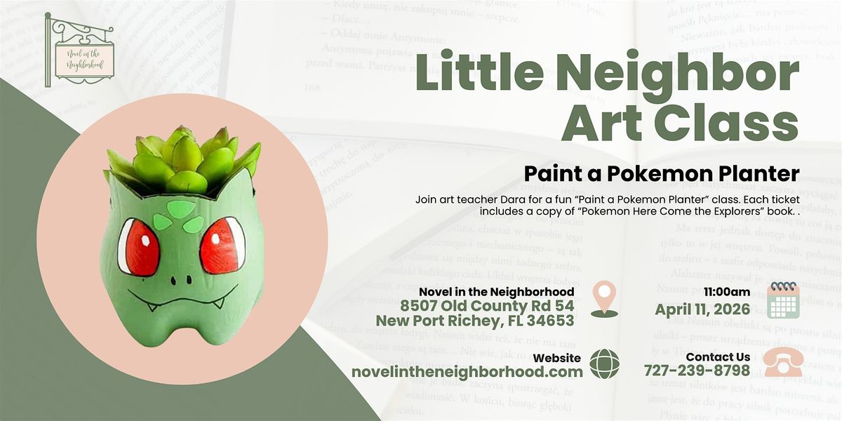 Join us for a morning of painting and fun as art teacher Dara Tucker shows little neighbors ages 4 and up, how to paint their very own Pokémon planter! Each $20 event ticket includes all supplies and a copy of "Pokémon: Here Come the Explorers" book. Registration is required and space is limited.