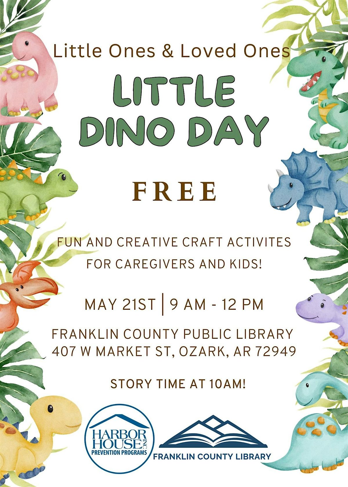 Come celebrate spring at the Franklin County Library, hosted by Harbor House Prevention Programs. All guardians are welcome! Bring your little one for a fun-filled event inspired by dinosaurs. It’s the perfect way to welcome the spring and make special memories with your little one. We can’t wait to see you there!