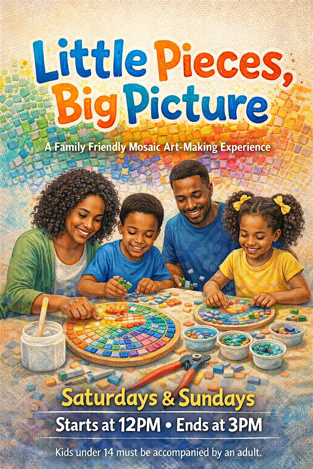 Join us for Little Pieces, Big Picture, a hands-on mosaic art experience designed for all ages and all skill levels. This creative session invites families, friends, and solo artists to slow down, have fun, and bring their ideas to life—one tile at a time.