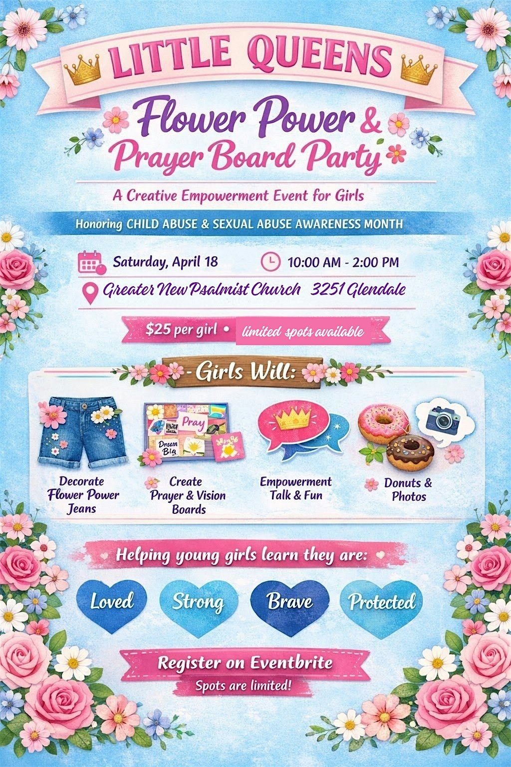 Get ready for a super fun in-person event where creativity blooms! Join the Little Queens crew for a Flower Power themed prayer board party.