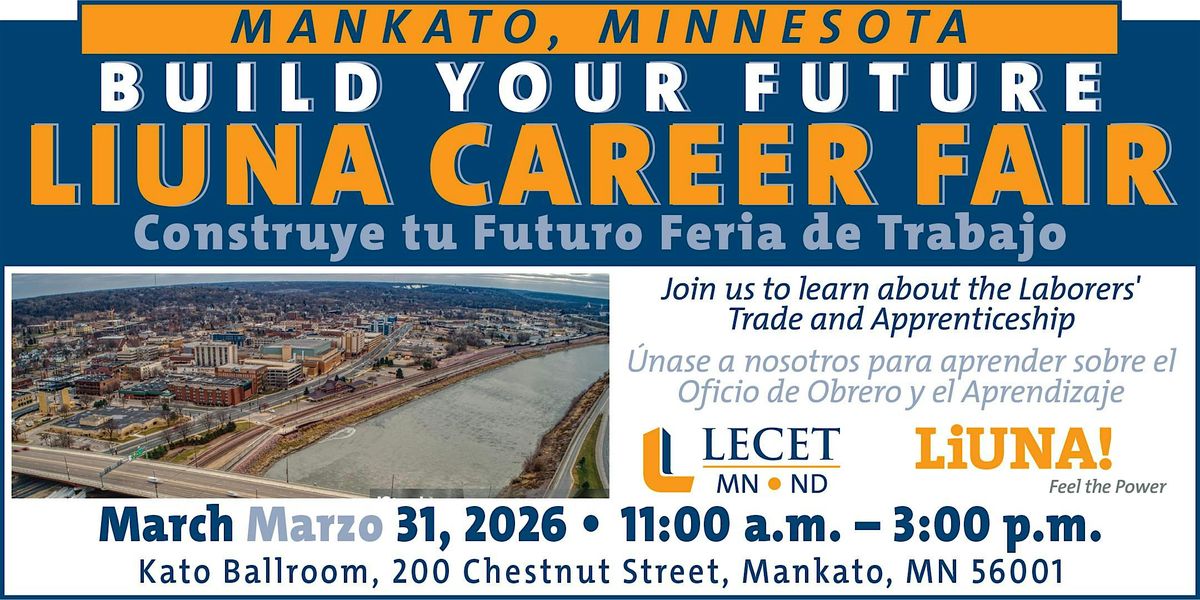 Looking to jumpstart your career in construction? LIUNA is hosting a Construction Career Fair in Mankato, MN! This in-person event is the perfect chance to meet industry pros, learn about exciting job opportunities with Union contractors, and get your foot in the door. Whether you're new to construction and interested in Apprenticeship training options or looking to move up, don't miss out on connecting with top employers and discovering your future in the building trades. See you there!