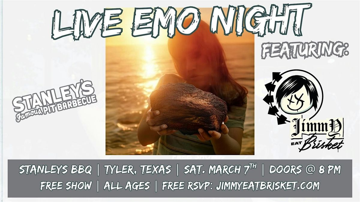 Get ready for a full night of early-2000s emo and pop-punk nostalgia as Jimmy Eat Brisket brings Live Emo Night to Stanley’s Famous BBQ Pit in Tyler, Texas on Saturday, March 7th. Expect loud sing-alongs, high energy, and all your favorite songs from bands like Blink-182, My Chemical Romance, Fall Out Boy, Jimmy Eat World, Paramore, Green Day, Sum 41, Panic! At The Disco, New Found Glory, Yellowcard, and more.
